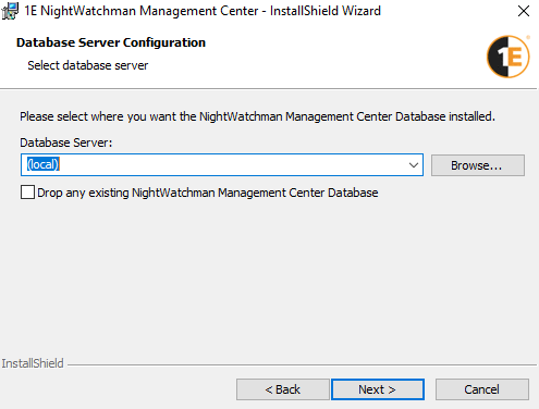Check theDrop any existing NightWatchman Management Center Database box, if you want to remove the existing database before installing the new one. Leave this box unchecked to use the existing database, in case of a re-install or upgrade.