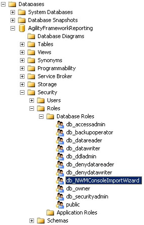 Installs database support components on the local application server, as well as the SQL Server database and SQL Agent jobs on the SQL Server database instance that you specify in next screen. You can only have one instance of the database components per implementation. The database holds all the information returned by NightWatchman clients and the WakeUp agents and forms the basis for the reports, as well as the configuration settings, and policies. The default name of the database is AgilityFrameworkReporting. |
