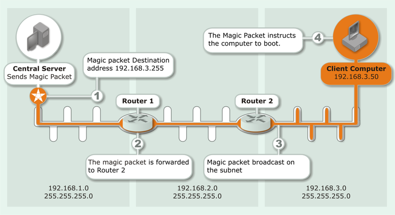 Magic packets sent using subnet directed broadcast are forwarded by intervening routers, and then broadcast only once they reach the destination subnet. The computer with the specific MAC address in the magic packet will respond and wake up. For this method to be successful, all intervening routers must be configured to enable subnet-directed broadcasts forwarding.