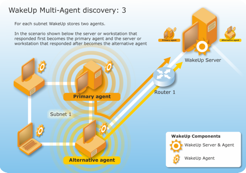 The WakeUp server communicates with the recently used primary agent. If this agent is unavailable, it attempts to use the previously discovered alternate agent. If neither are available, it attempts to locate other agents on that subnet.