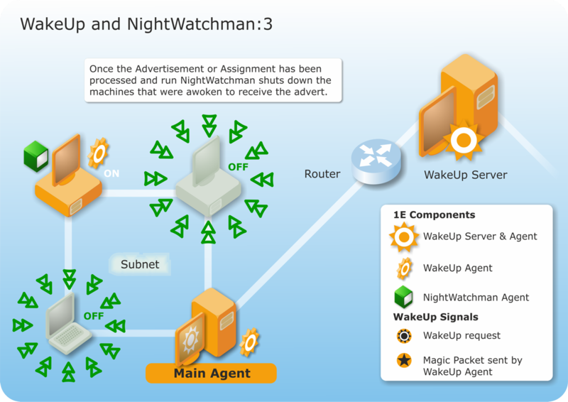 WakeUp and NightWatchman combine with Configuration Manager to provide a complete solution for scheduled software distribution. WakeUp can be used with Configuration Manager to ensure that computers are powered-on to receive a scheduled software distribution from Configuration Manager. NightWatchman ensures that all the awoken computers are powered-down after the software distribution to ensure minimum power usage.