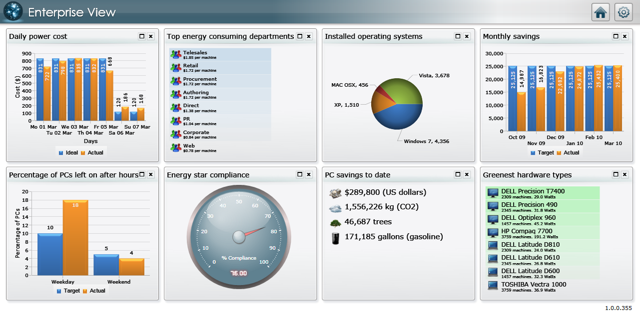 Enterprise View is a web-based business intelligence dashboard that provides overviews of energy consumption and computer-related information from your network. You can customize the dashboard by choosing which tiles to display from a pre-defined list. It uses information already held in the reporting database to populate the tiles.