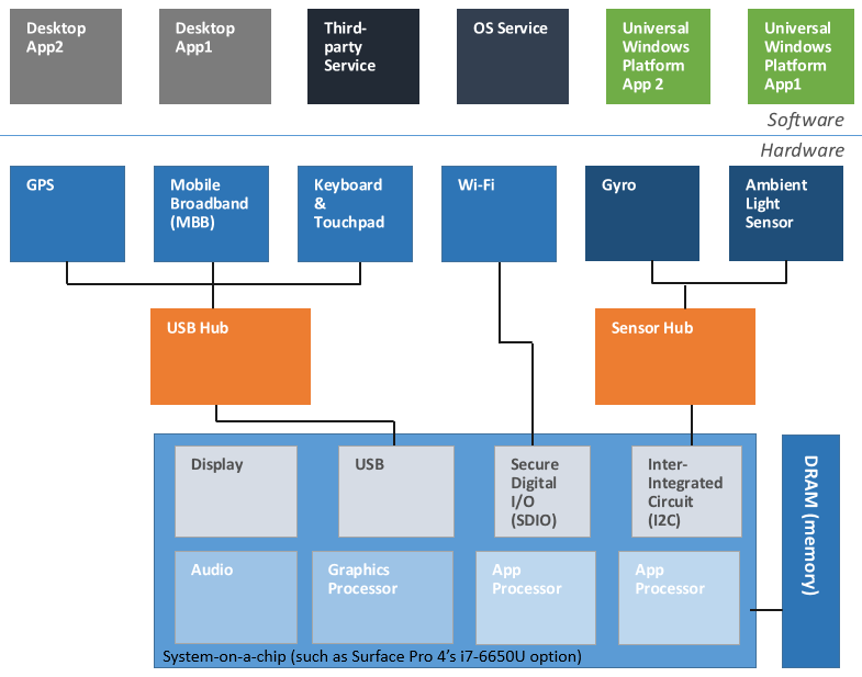 When the device is in use, all the components can be active and use considerable power. If the user stops using the device, or hits the on/off switch, the display powers off and after a short period, the display and graphics processor components enters into low power states. After an additional period of time, other components, such as sensors and communications interfaces will also enter low power states. When all these are in low power states, the hubs can enter low power states. Before long the system-on-chip itself will enter a low power state. The device is in DRIPS at this point.