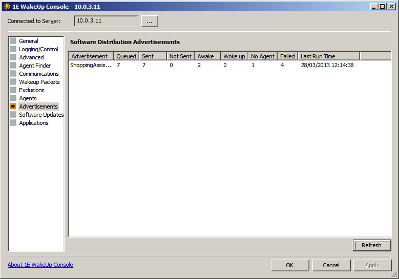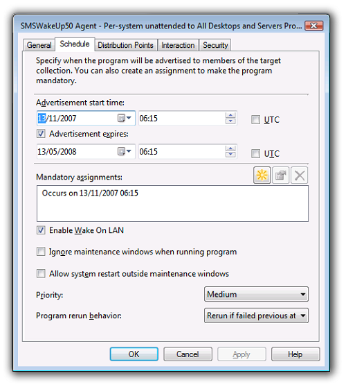 Enables interaction between WakeUp and NightWatchman. Computers woken by WakeUp are shut down providing there are no pending Configuration Manager jobs. Autoshutdown does not occur for manually requested wake ups, i.e. those from a right-click option from the Configuration Manager console, from the WMI interface or on the WakeUp command-line In NightWatchman, MONITORJOBS must be ON and PendingSMSJobWindowMins be non-zero, otherwise computers will not have time to process pending Configuration Manager jobs before shutting down again. These are the default values. You can override the general auto shutdown option and prevent shutdown on a per Configuration Manager Advertisement basis by including the text 'NoAutoShutdown' in the advertisement name or comment. |