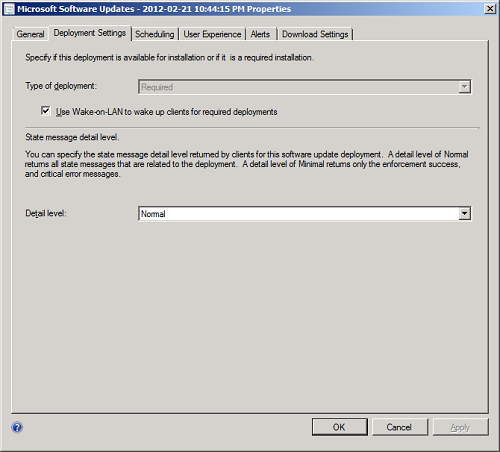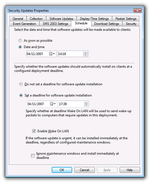 If checked, sets the use of WakeUp Server for software updates assignments. Only computers that are non-compliant (those needing the patch) are woken. The wake ups occur when the deployment deadline (when the Software Updates must be installed by) is reached. |