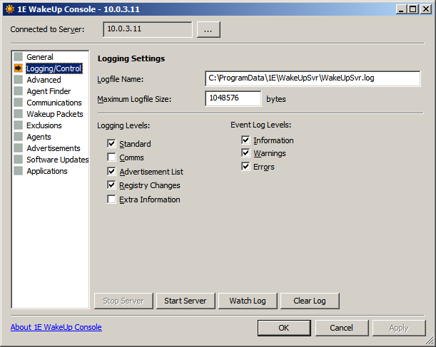 Event log levels Adds the category of WakeUp logging information to be put into the Windows Event log by the WakeUp Server. This only restricts the events that are logged during the wake up process, events such as service start and stop events and major communications failures and exceptions will always be logged.