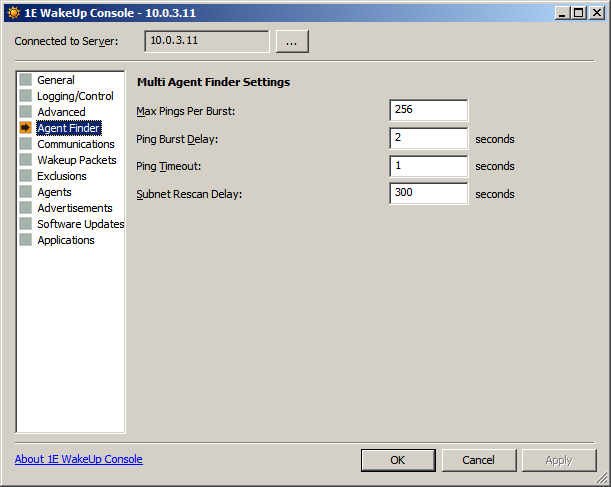 The Agent Finder screen controls how 1E Agents are discovered (using ping packets) when using Multi-Agent mode. You can set the number and frequency of pings sent, the timeout for receiving a response and how often the subnet is rescanned. This lets you set a balance between successfully finding all the Agents against the amount of network traffic generated.