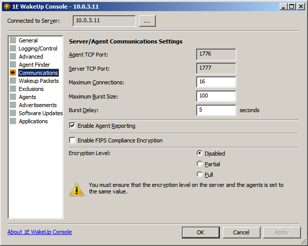 Setting the communication protocols between the Agents and the WakeUp server. Refer to The Communications screen.