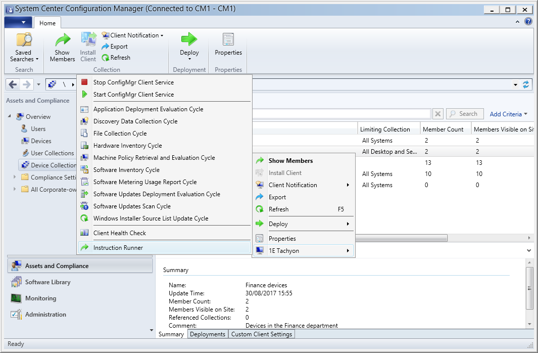 The context menu is displayed by right-clicking on a Device Collection in the Configuration Manager console. This Device Collection also defines the set of client devices that the Instruction Runner will question or action. The picture shows the context menu for the Finance devices collection with the 1E 1E sub-menu displayed and the Instruction Runner menu item selected.