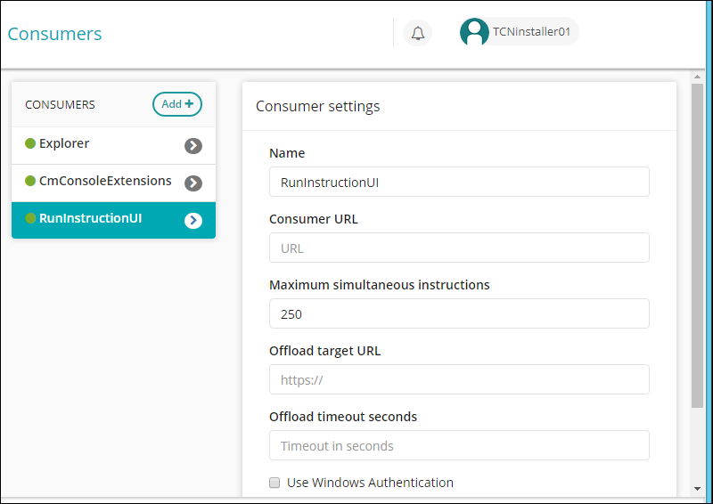 The first time the Instruction Runner menu item is selected, 1E will automatically attempt to create a Consumer for the Instruction Runner. For this to work correctly, the account used to run the Configuration Manager console must have the Full Administrator role assigned in 1E. If the appropriate permissions are there, a RunInstructionUI consumer will be created, as shown in the picture. This operation only needs to succeed once, and no further configuration is necessary.