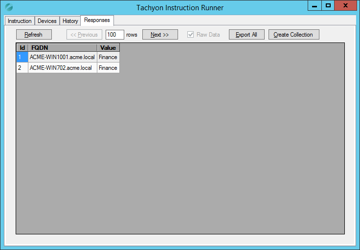 The Devices tab shows the devices contained in the selected Configuration Manager Device Collection. In our example, as shown in the picture opposite, it shows the two devices in the Finance devices collection. You can further reduce the devices that the question will be run on by unchecking the checkbox at the beginning of the row with the device name you want to exclude.