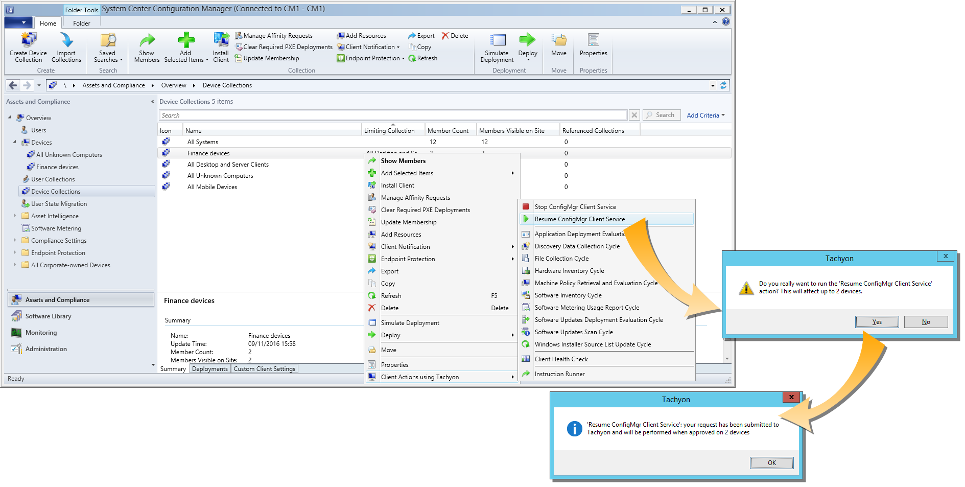 The picture shows the Resume ConfigMgr Client Service menu item being selected from the context menu for the Finance devices collection and the subsequent confirmation and notification dialogs.