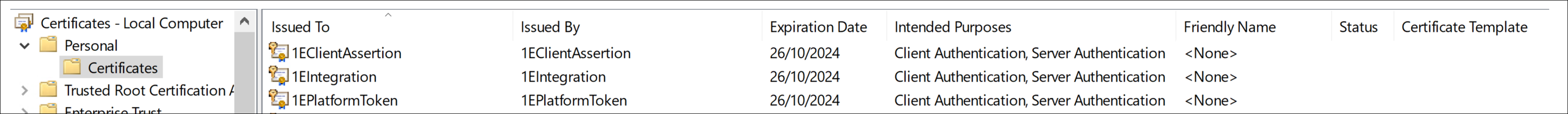 If you have configured 1E Server to require client certificates then each device requires a certificate with the following properties, so the client can be authenticated by the 1E Switch. Refer to Client certificates.