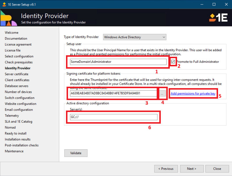 Details required when using 1E Server Setup to install a 1E server