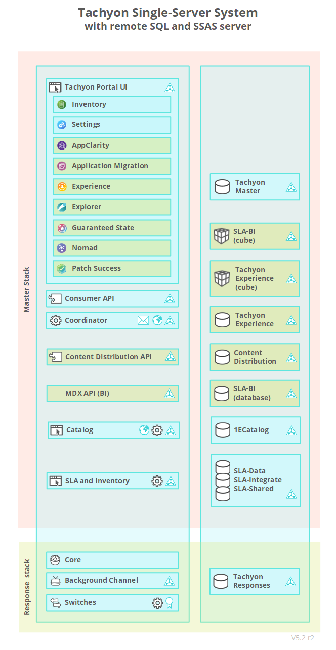 However, it is also supported to split some of 1E components between multiple servers - in this configuration creating a 1E Master Stack server (Coordinator Service, Consumer API, Experience and SLA Inventory components) and one or more 1E Response Stack servers (Switch, Background Channel and Core components).
