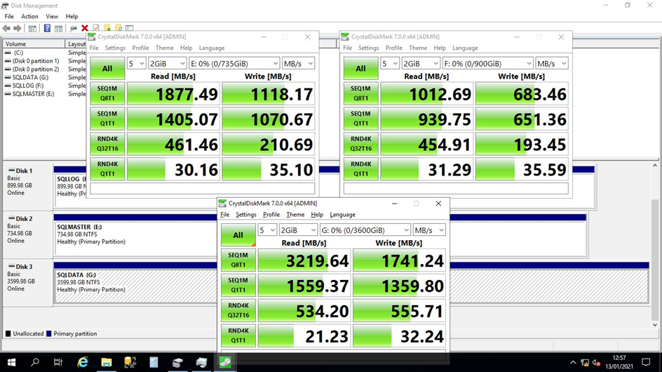 Under the hood, CrystalDiskMark uses the Microsoft tool Diskspd (DISKSPD 2.2) which can be useful to run on its own to get a simple and reproducible way to measure different server and VM disk subsystem performance. Use the following command line to test each of the relevant SQL volumes, by drive letter, in turn.
