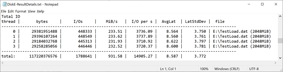 Once complete, review the output in the created results file GDisk_resultdetails.txt for the Total IO thread section. In the following example, the total throughput in MiB/s is measured at 931.58.