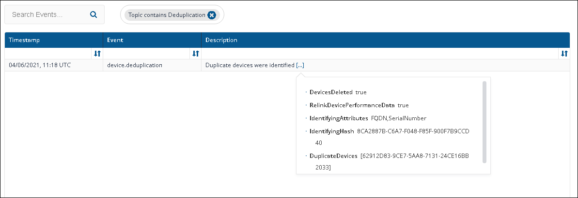 When the DeleteDevices argument is set to true, the Device table is updated for each device where older duplicates of it have been identified. Each device will have a timestamp set for LastDeduplicationUtc column, as well as an Experience event logged. The timestamp is updated when one or more new duplicates are found. There is also a DeduplicationCount column which represents the number of complete Device Deduplication processes where a device has been found to have duplicates. These values will only be set on the device identified as being the most recent device that will be kept, not it s duplicates.