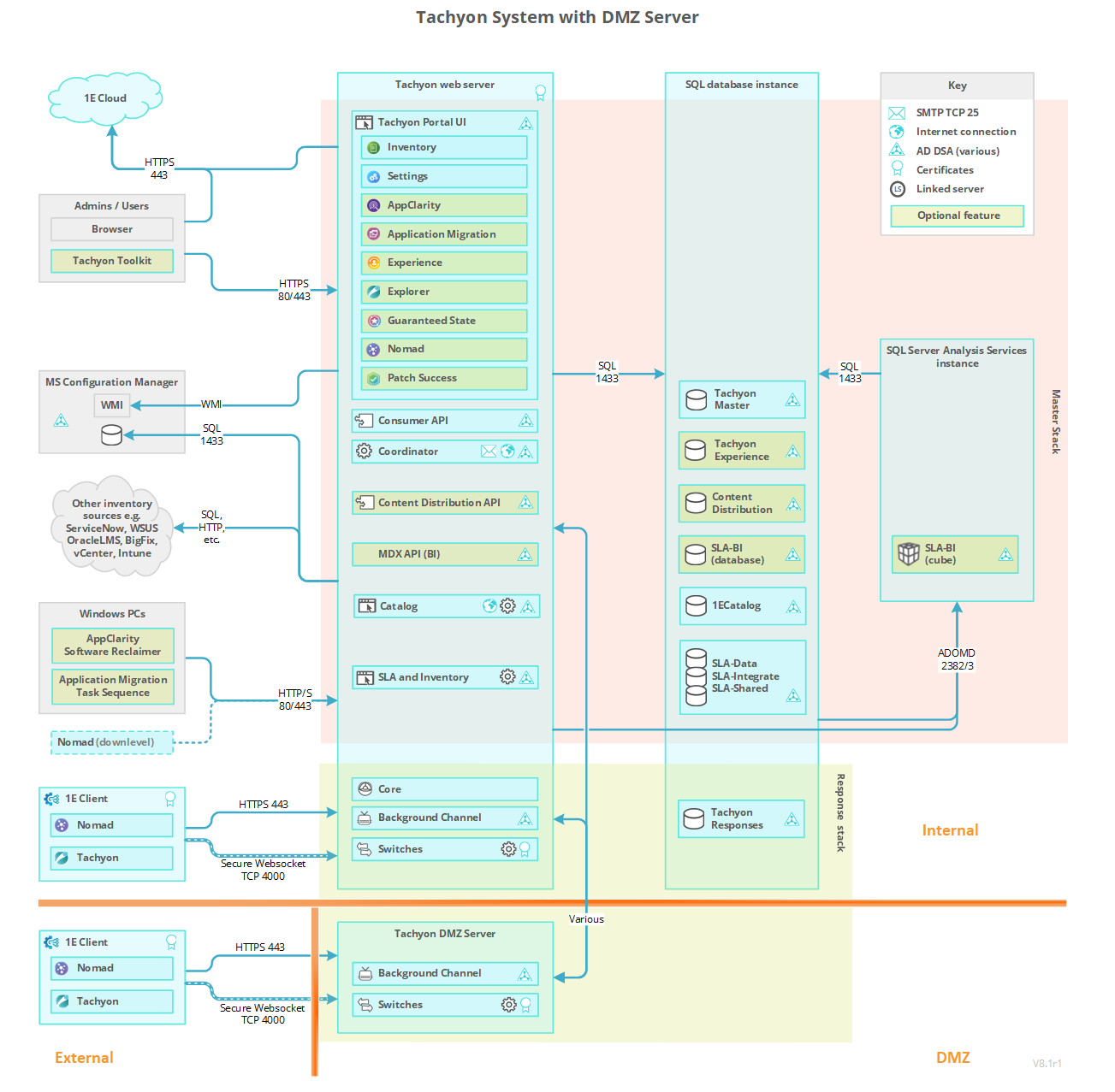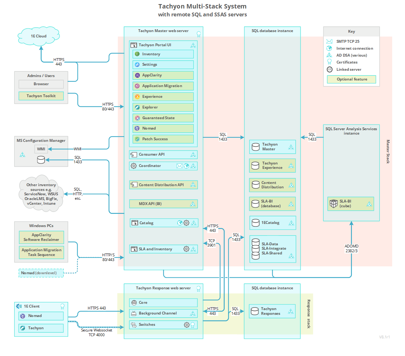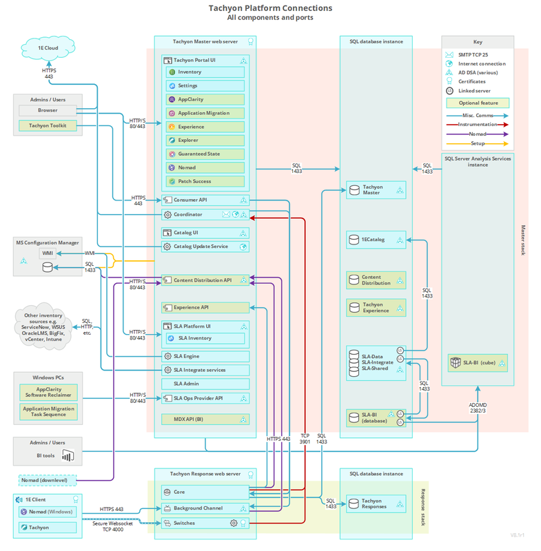 Console browser connections to Tachyon Portal UI Console browser connections to SLA Platform UI Console browser connections to 1E Catalog UI Consumer connections toCatalog API Consumer connections to Consumer API Consumer connections to SLA Operations Provider API |