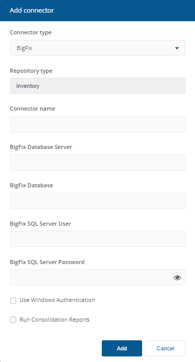 In the Add Connector pop-up window, select BigFix as the connector type.