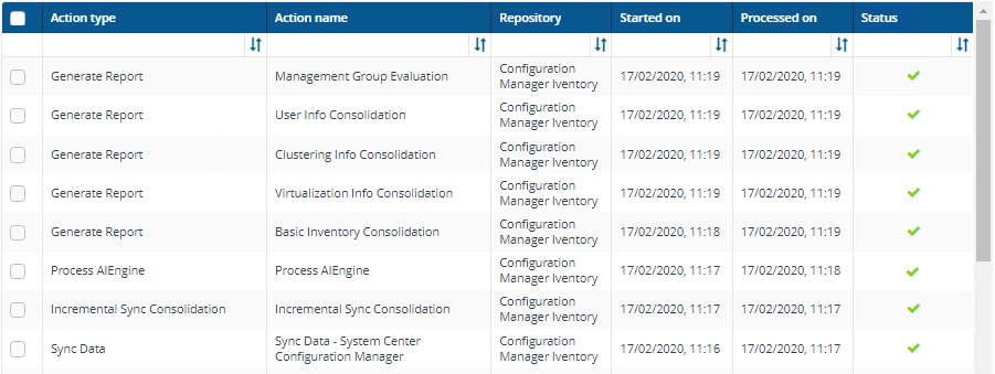 If you enable this on more than one connector, it can lead to unnecessary processing. The recommended method of processing consolidation actions is to schedule the action Generate Report - Basic Inventory Consolidation to execute after the Sync Data actions have run for all connectors. This will execute the remaining consolidation actions. Alternatively, select the Run Consolidation Reports checkbox on one of your connectors. You can view action processes in Settings > Process log.