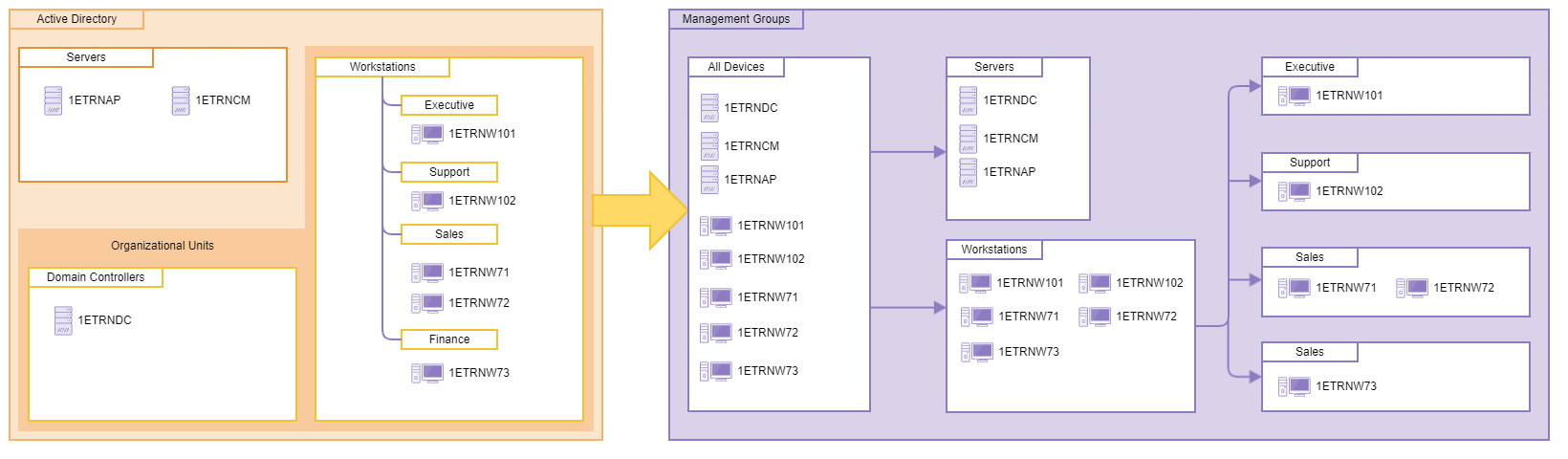 • Servers, Workstations, Executive, Support, Sales and Finance - these Management Groups will use an OU rule to separate the devices according to the OU they belong to.