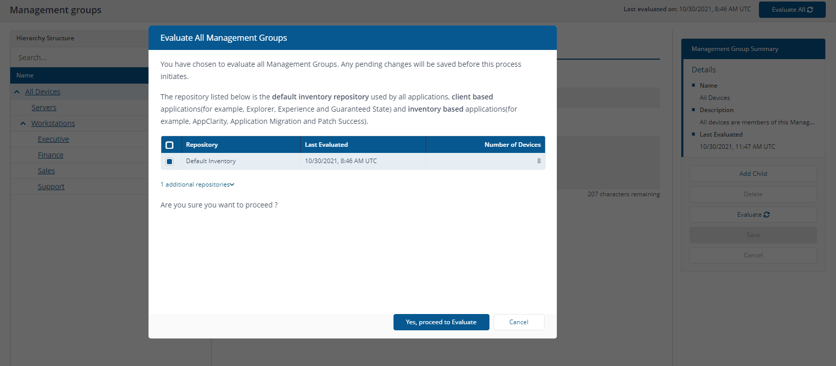 1. Click on the Evaluate All button in the top right corner of the page, if you have more than one inventory in your 1E configuration you will be prompted to choose which repository you wish run evaluate your Management Groups against. Then click Yes, proceed to Evaluate.