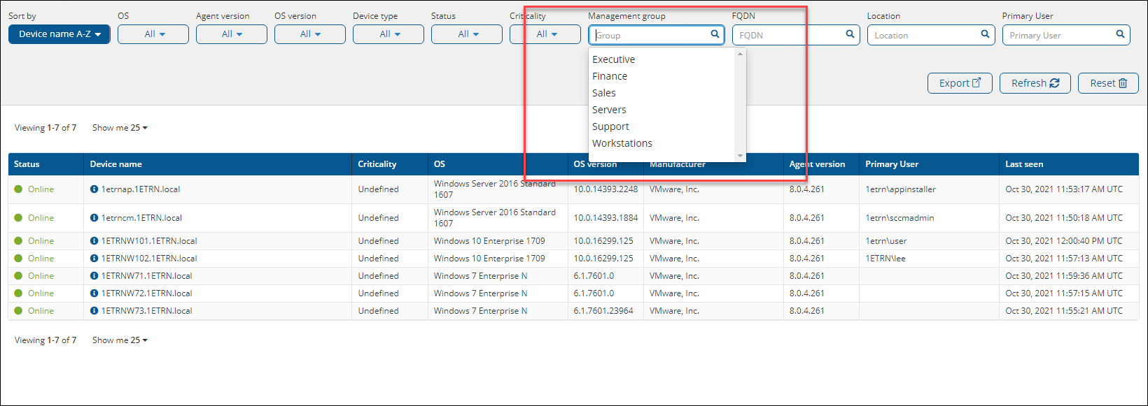 4. Selecting a Management Group from the menu filters the devices to show just the ones that belong to that Management Group.