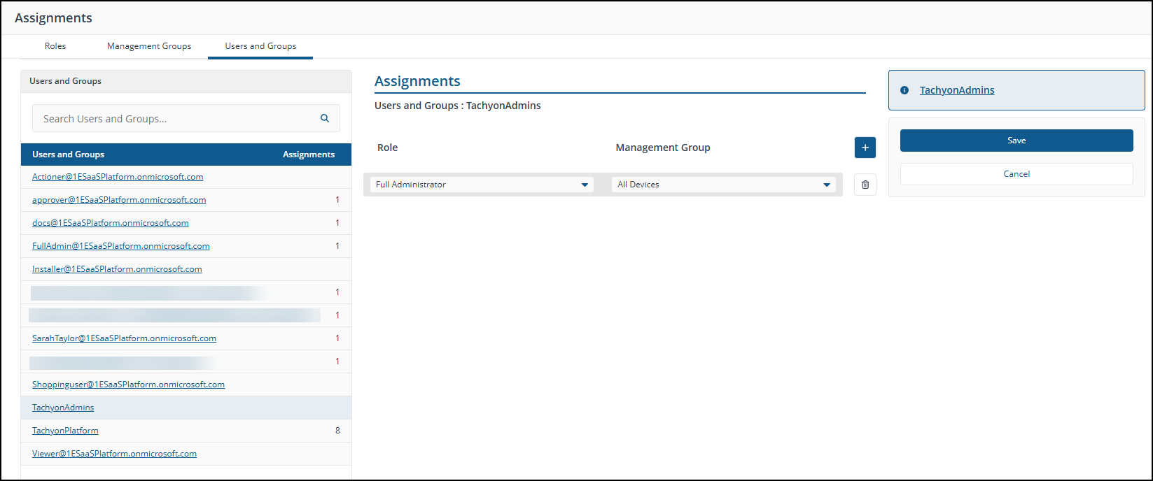 Once added to 1E Platform, you can use Assignments to edit the roles for a 1E user or group. Refer to the Assignments page