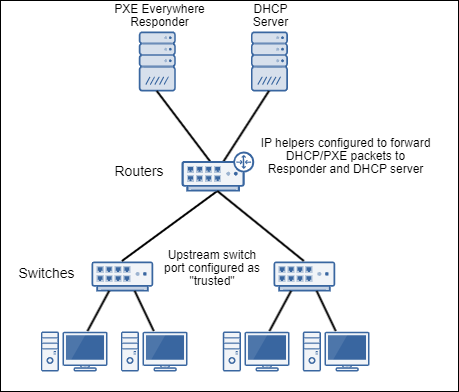 If you decide to install PXE Everywhere Responders, you will need to configure network switches to allow the PXE Everywhere Responder to receive and respond to PXE requests on port 67. Typically, this requires configuring the switch port connected to the router as "trusted". Refer to the switch manufacturer's documentation for more details.
