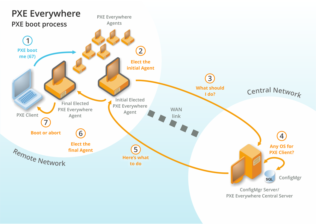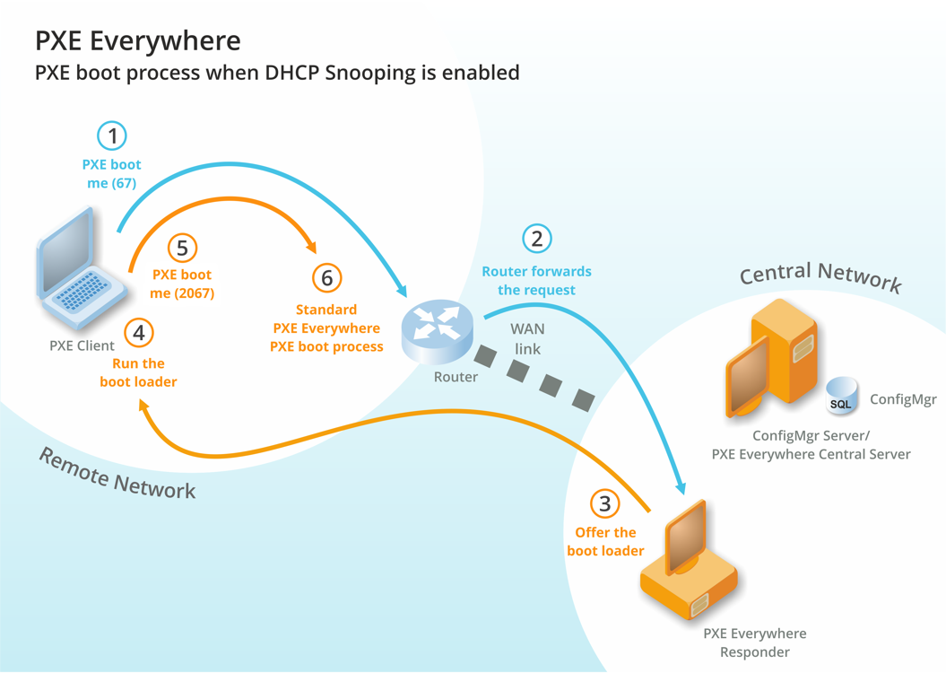 Standard PXE Everywhere PXE boot process. From this point on the process follows from step 2 in the standard process detailed above.