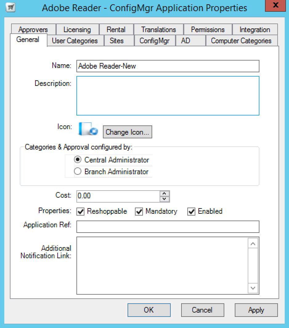 • Cost – the cost (displayed in the currency defined in the Shopping Central server) for the application. This value is used in the Shopping Web portal, Shopping basket and in email notifications.