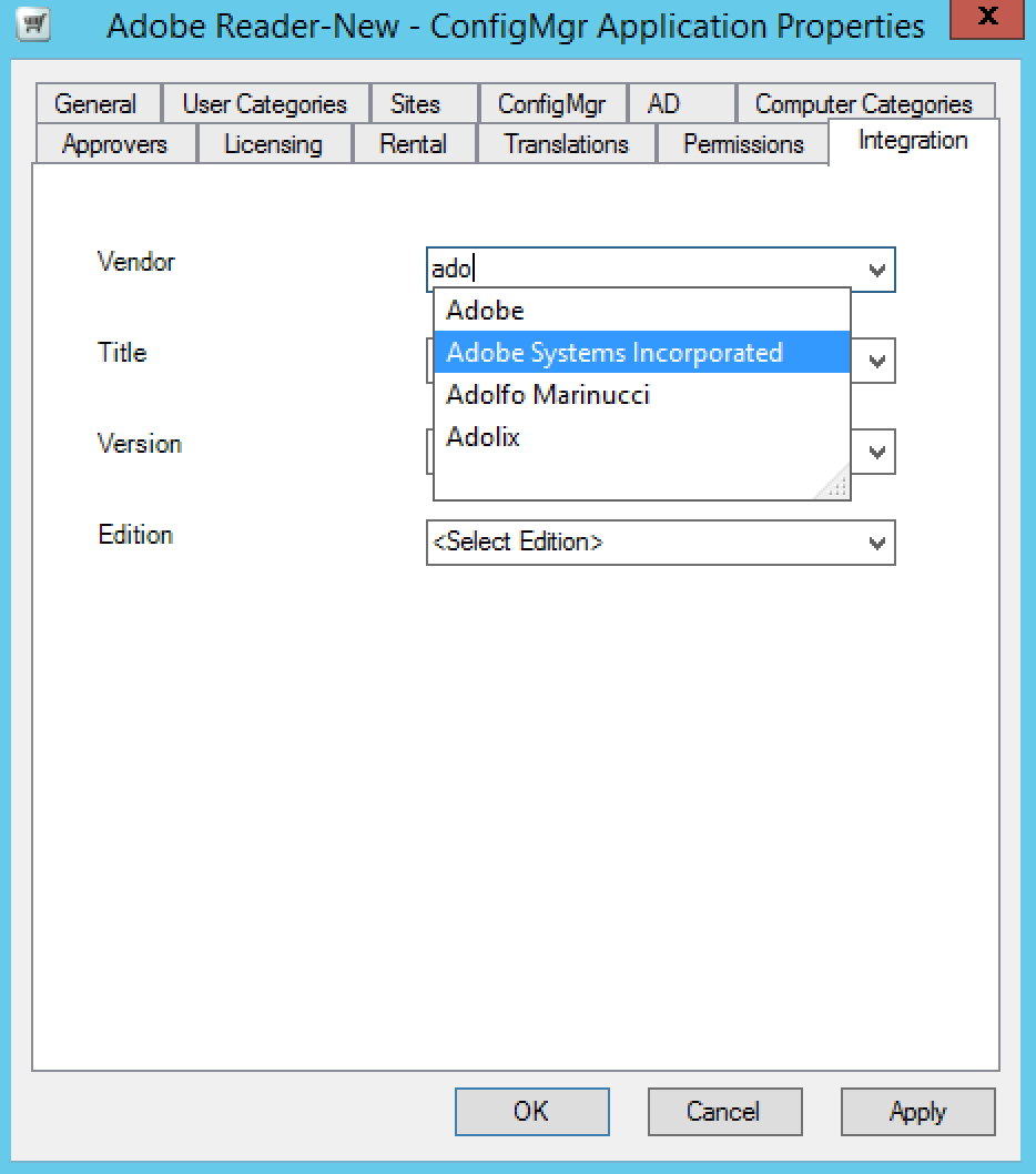 1. Click the Vendor list and associate it with Adobe Systems Incorporated.