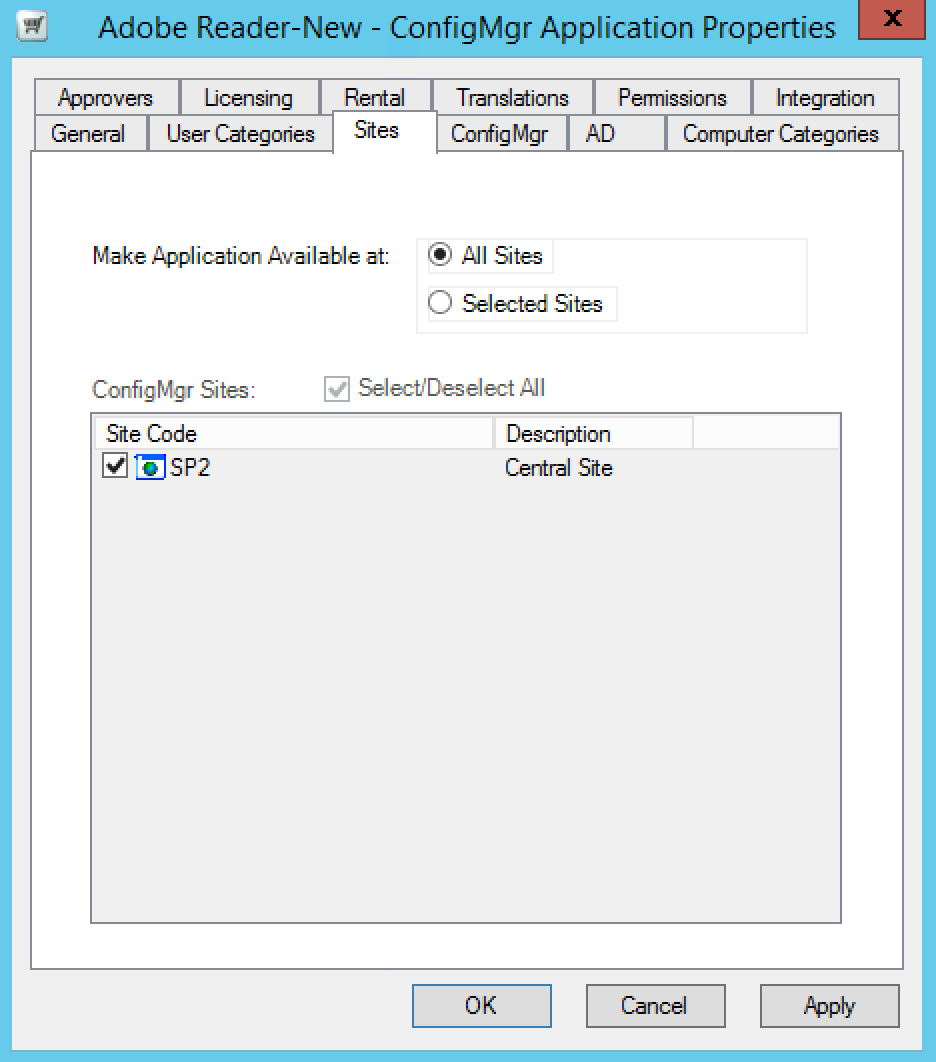 • All Sites – the application is available in all Configuration Manager sites, including ones that are added at a later stage