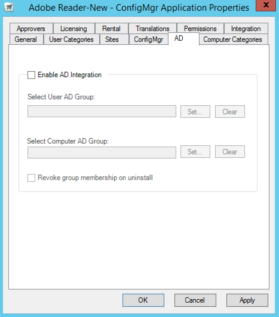 Use the AD tab to associate Active Director groups with the application (see Active Directory membership applications) where users or machines shopping for it automatically become members those groups and get their memberships revoked when the application is uninstalled.