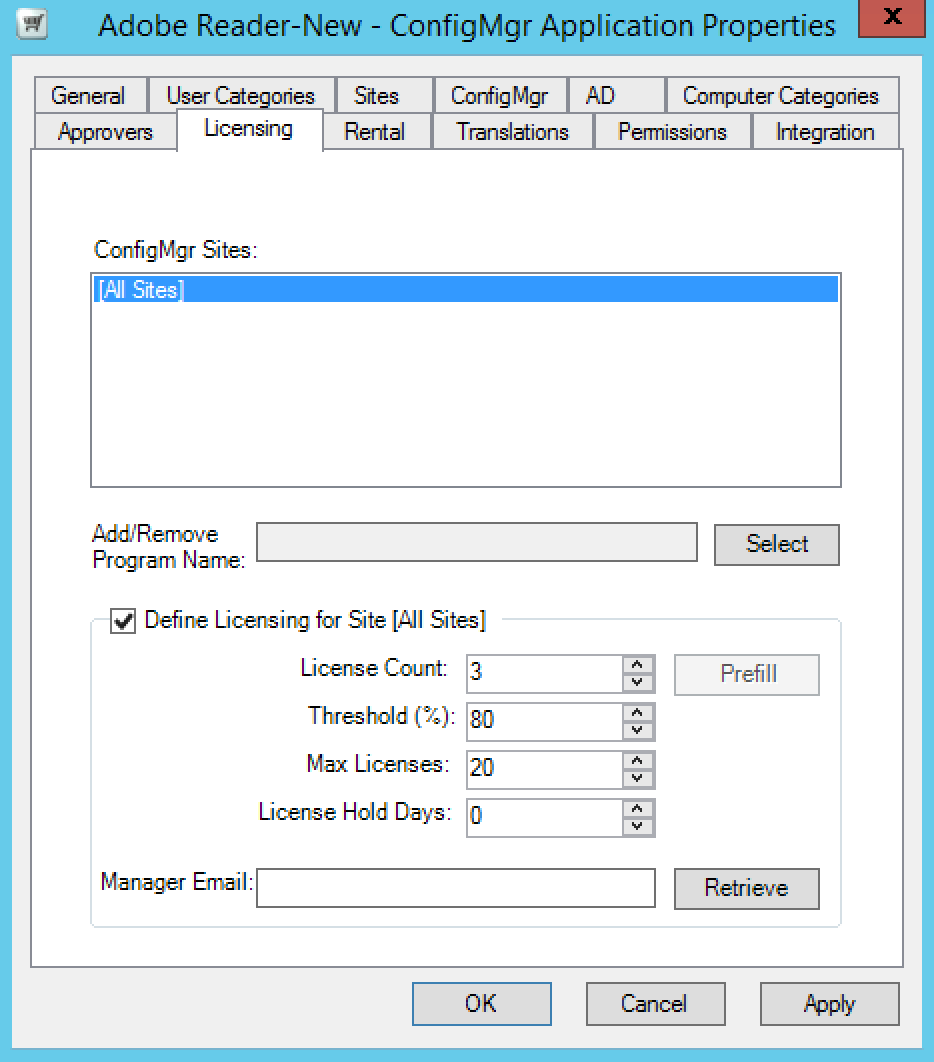 Managing the licensing aspects for the application in Configuration Manager sites which can be for all Configuration Manager sites or on a per-site basis. See Application license management for more details.