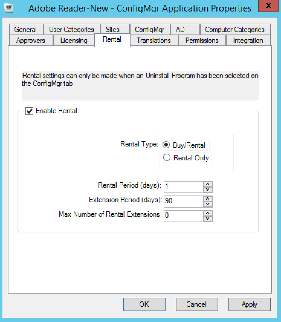 Only enabled for Configuration Manager applications if Can be uninstalled is checked Configuration Manager tab and for non-Configuration Manager applications if AD group membership is defined and Revoke group membership on uninstall is checked in the AD tab. It also enables an application or AD group membership to be shopped for on a rental basis. It means that users get the use of an application for a set period of time after which it will be uninstalled. See Application rental and Active Directory group membership rental for more details.
