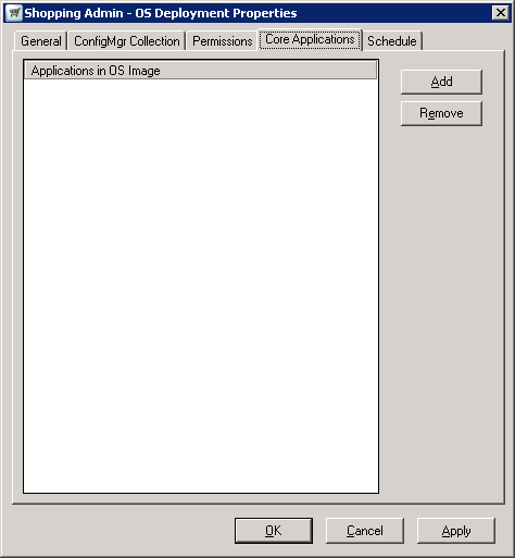 In the Core Applications tab, you can add the names for applications that are already built-in to the OS image. These applications are displayed in the OS migration wizard, and the Shopping Web to assist the user in choosing the application they want migrated to the new OS.