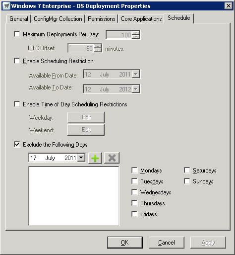 Exclude the Following Days – enforces the days when the OSD Application is unavailable for deployment.