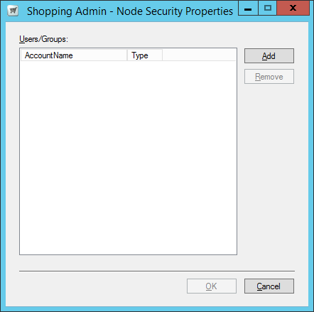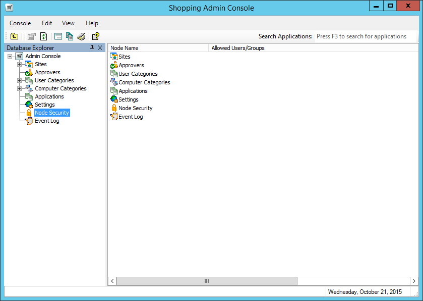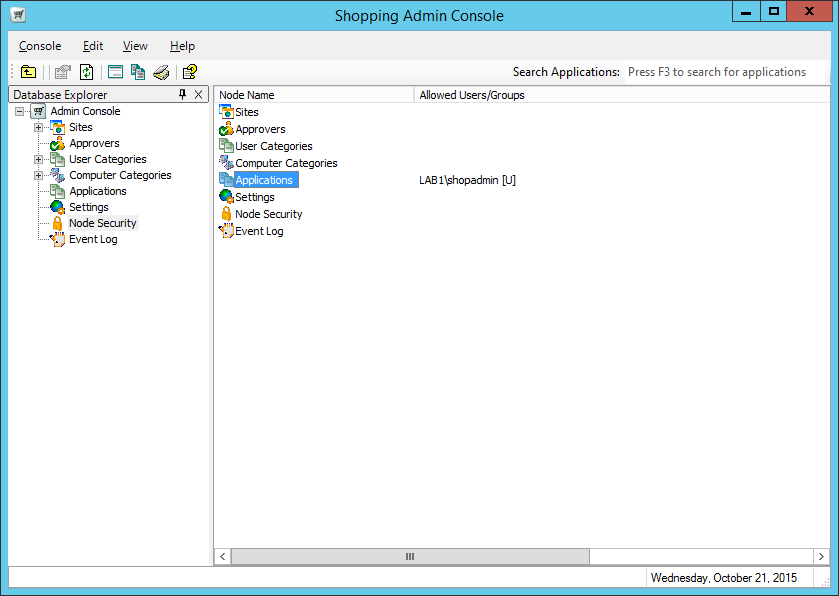 Access to each of the nodes in the Shopping Admin Console has an implied set of permissions to access the Shopping and Configuration Managerdatabases. Prior to installing Shopping, three AD groups must be created and supplied to the Shopping installer. These groups govern the level of access to the Shopping and Configuration Manager databases, with the permissions being added by the Shopping installer.