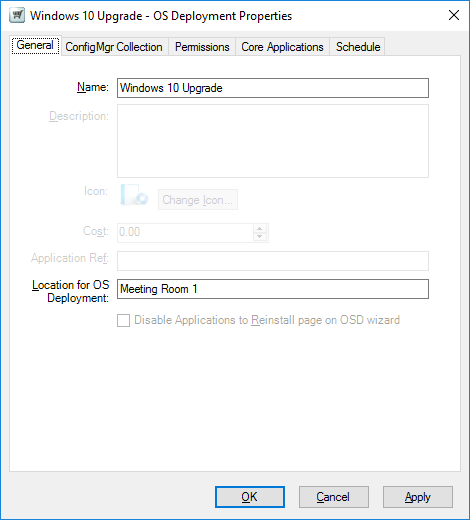 On the General tab in the OS deployment Properties dialog, the two fields of interest are the following: