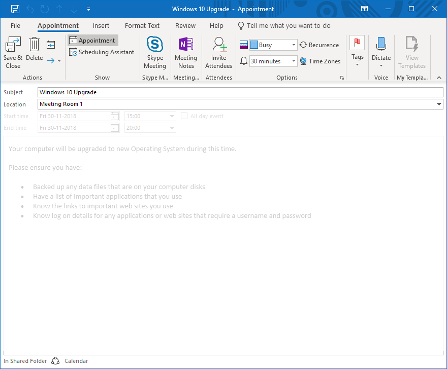 Location for OS Deployment – the location is used as the Location for the reminder.