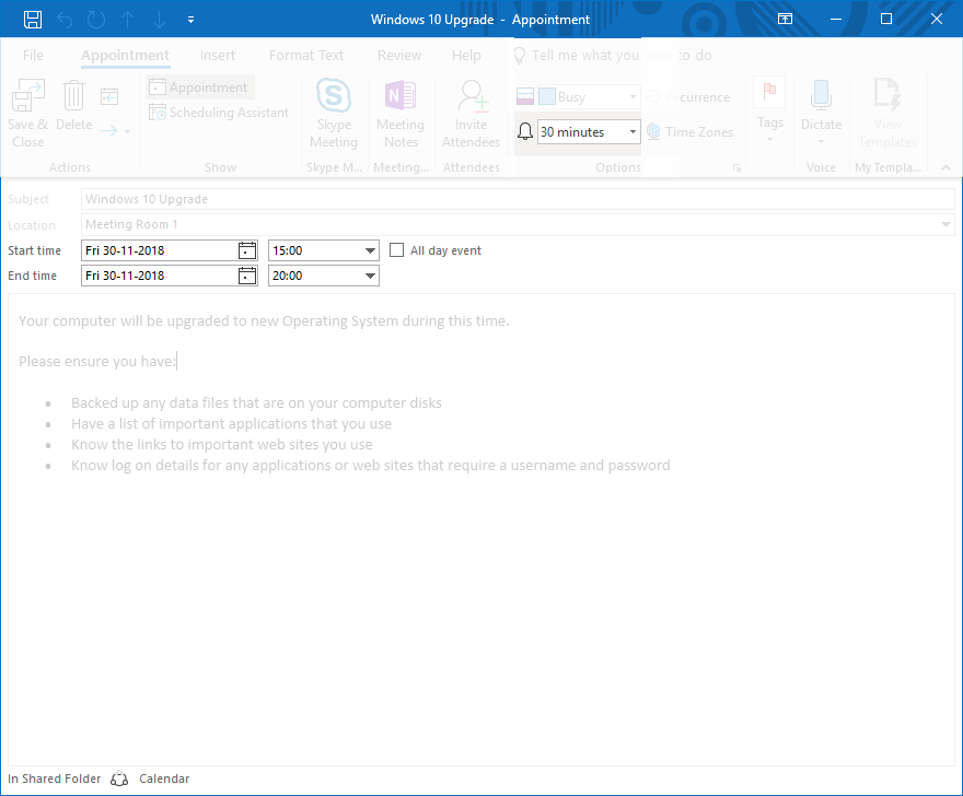 In the ribbon, the reminder is set to display 30 minutes before the OS deployment takes place. This value is derived from OS Deployment Calendar Reminder Time under Settings in the Shopping Admin Console.