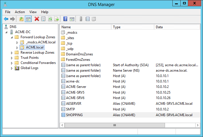 In DNS, you can create a CNAME or Host (A) record. The example below uses a CNAME alias of SHOPPING for the host server ACME-SRV6.ACME.LOCAL which results in a host header FQDN of SHOPPING.ACME.LOCAL. In this case, the server's FQDN suffix is the same as the Alias FQDN's suffix, but they do not need to be the same.