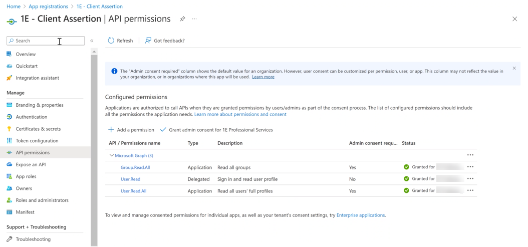 Navigate to Azure Active Directory > App Registrations > 1E Client Assertion > Certificates and upload the certificate.