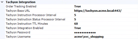 Set Tachyon Username and Tachyon Password to a 1E account. This account can be the same as the Shopping Central service account, but to keep to the principal of minimal privileges should be a unique account only used for connecting Shopping to 1E. The account requires no privileges other than being defined as a 1E account and having the 1E Shopping Administrators role.