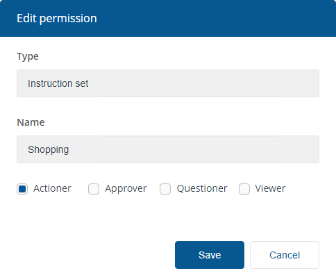 It's a good idea instead to restrict the range of 1E instructions made available to Shopping administrators to specific Instructions sets. Then, when Shopping administrators are creating 1E instruction applications to make them available to users, they will only be able to select from the 1E instructions available in those sets - not all the 1E instructions. Regardless of whether the Instructions sets contain both action and question instructions, the Shopping administrators will only see action instructions.