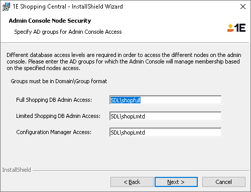 SHOPPINGCONSOLEADMINUSERS="ACME\FullShopAdminsGroup" ^