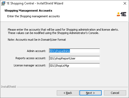 This user is to be added as a Shopping administrator in the 1E Platform. The user name must be in UPN format.