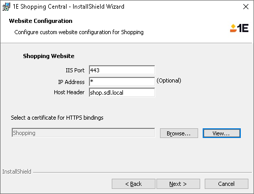 You must ensure a suitable web server certificate exists in the local machine certificate store, and permissioned to allow the Shopping Installer Account and Shopping Central service account to read it. Default permissions are sufficient. For web server certificate requirements, please refer to Shopping Server certificate.
